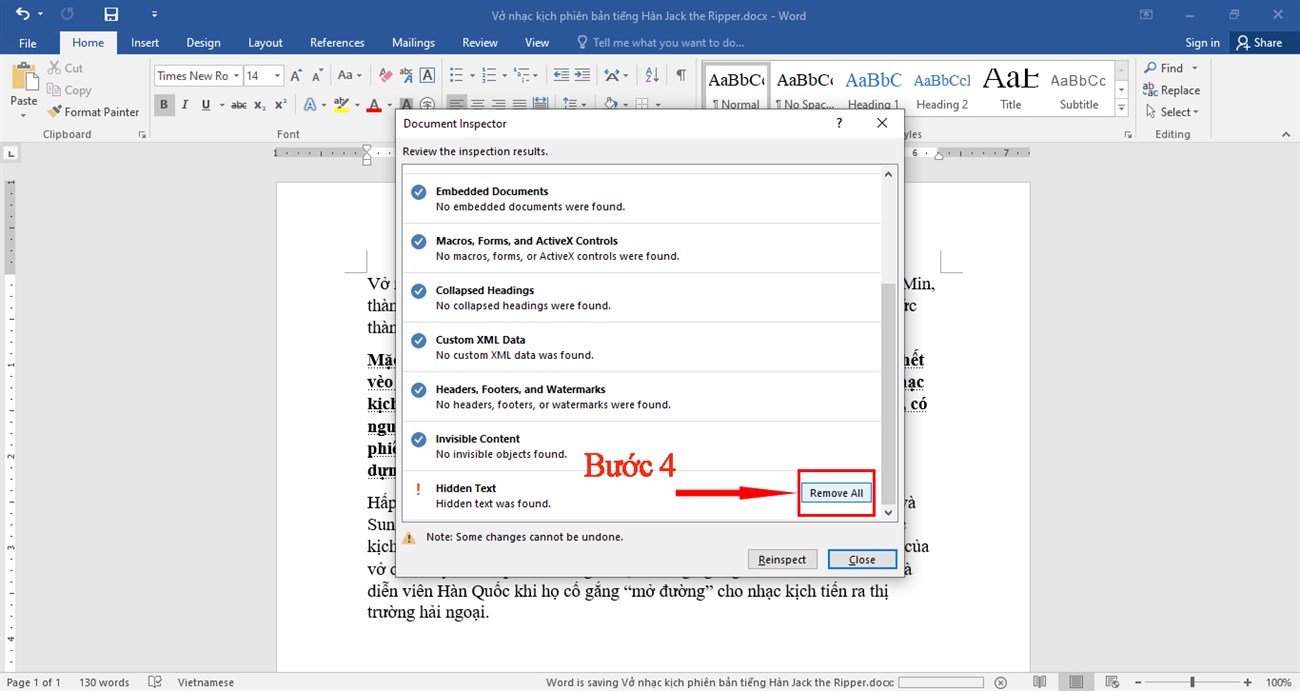 Bước 4: Sau khi hoàn tất, Document Inspector sẽ liệt kê tất cả các đoạn văn bản bị ẩn trong tài liệu. Để xóa toàn bộ văn bản ẩn cùng lúc, bạn chỉ cần nhấn Remove All.