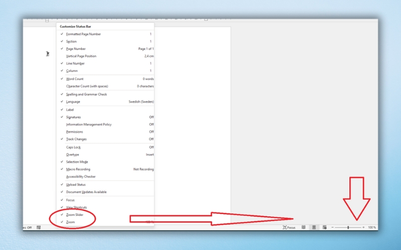 - Bước 2: Nếu không thấy thanh Zoom, hãy nhấn chuột phải vào thanh trạng thái (Status Bar) nằm dưới cùng cửa sổ Word.